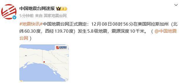 中国地震台网正式测定:12月08日08时56分在美国阿拉斯加州(北纬60.30度,西经139.70度)发生5.8级地震,震源深度10千米。