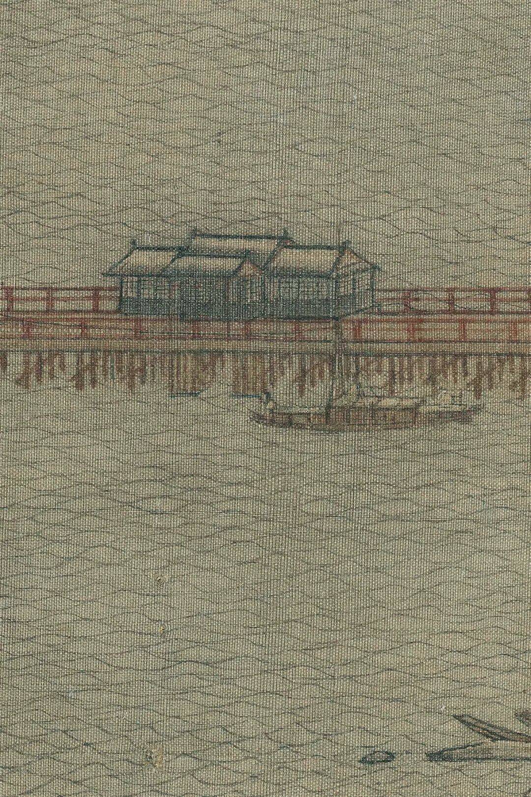 宋佚名《长桥卧波图》以23.9×26.3厘米的绢本扇面,在方寸之间构建出超越物理尺度的空间叙事。此作突破传统山水画“三远法”的构图范式,以近乎水平延展的桥梁为视觉轴线,将佛塔、帆船、远山等元素垂直嵌入画面,形成“横纵交织”的网格化空间结构。这种设计不仅暗合宋代《营造法式》中“模数化”建筑思维,更通过桥梁与水面的虚实对比,将“长桥卧波”的物理形态升华为“天人合一”的哲学隐喻。